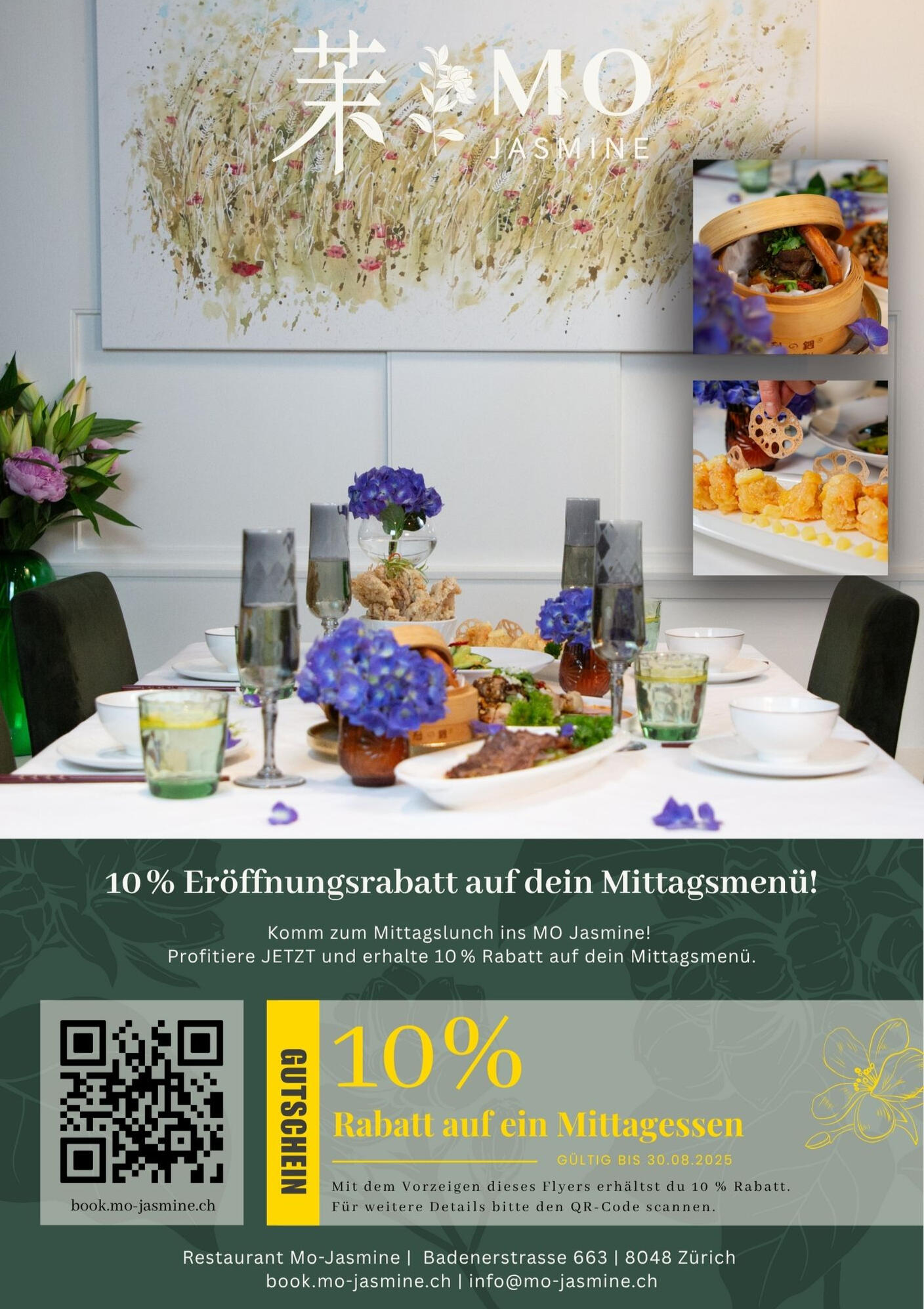 Dein Moment zum Aufblühen!Mo·Jasmine ist ein Ort, an dem florale Aromen, chinesische Klassiker und moderne Zürcher Leichtigkeit zusammenfinden.